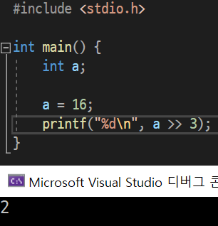 이렇게 a >> 3은 2가 나온다는 것을 볼 수 있다.