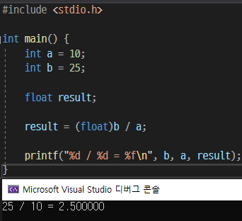 result = (float)b / a; //float 타입으로 형변환 하는 연산자는 (float), int는 (int)