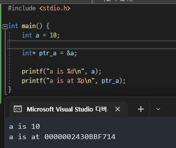 따라서 아래 코드는 ptr_a라는 int* 변수에 &a, 즉 a의 주소를 저장하는 코드이다.