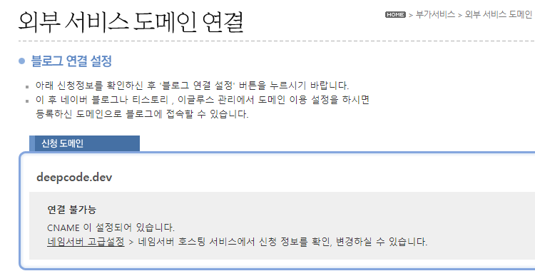또 '외부 서비스 도메인 연결'을 하면 www 서브도메인으로 등록된다.