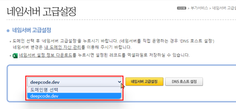 도메인 활용 / 부가서비스 -> 네임 서버 고급설정 클릭