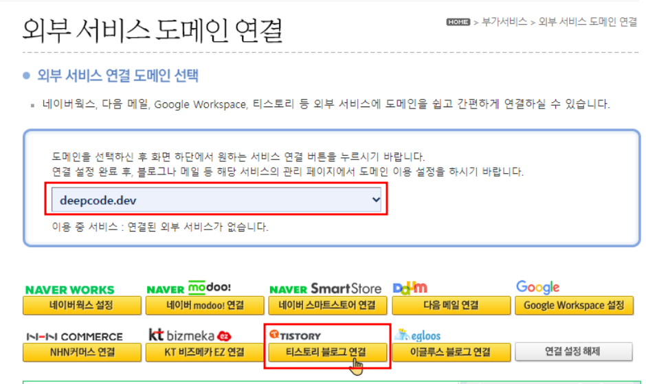 또 '외부 서비스 도메인 연결'을 하면 www 서브도메인으로 등록된다.