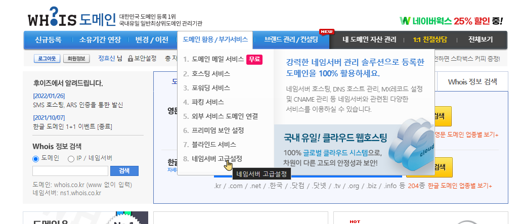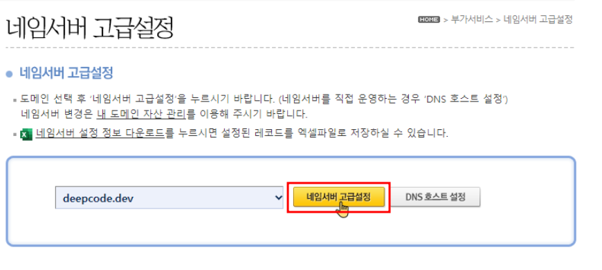 도메인 활용 / 부가서비스 -> 네임 서버 고급설정 클릭